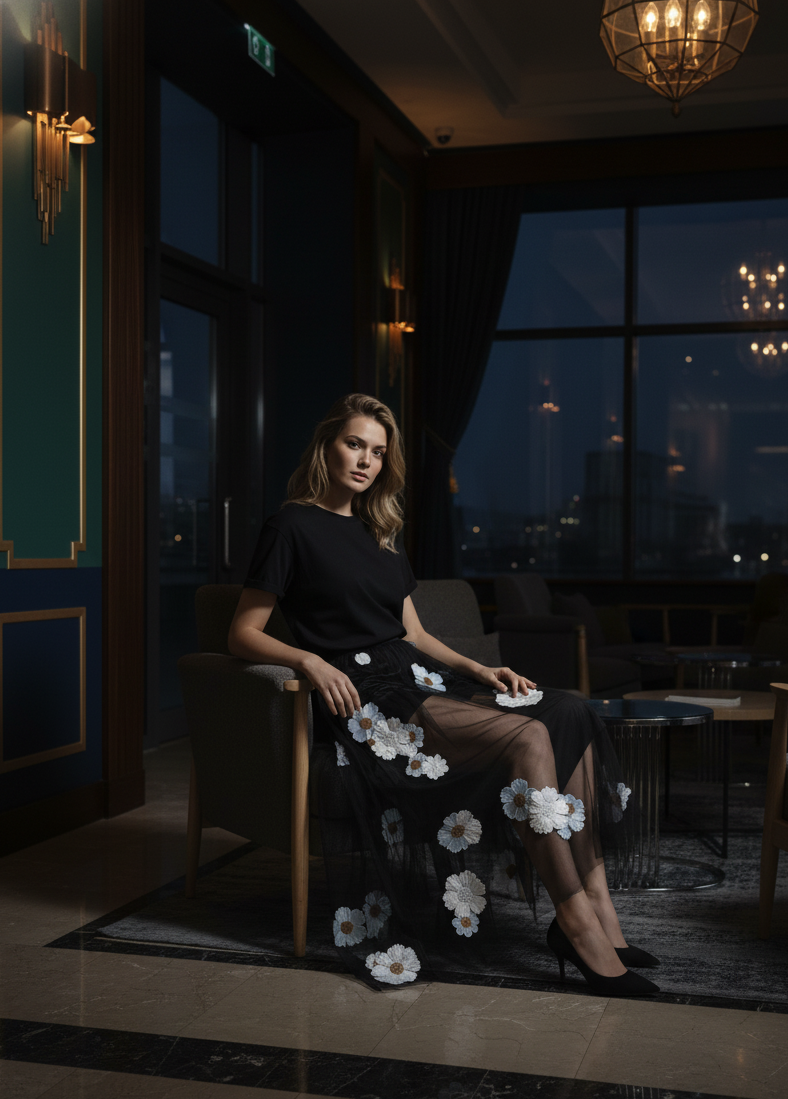 En fantastisk topp dekorerad med vita paljettblommor och transparenta paljetter som fångar ljuset med en subtil lyster. Pampas signatur-fjärilsärm med nedsänkt axel skapar en mjuk, drömlik silhuett som gör toppen perfekt för både fest och en mer uppklädd vardagslook.